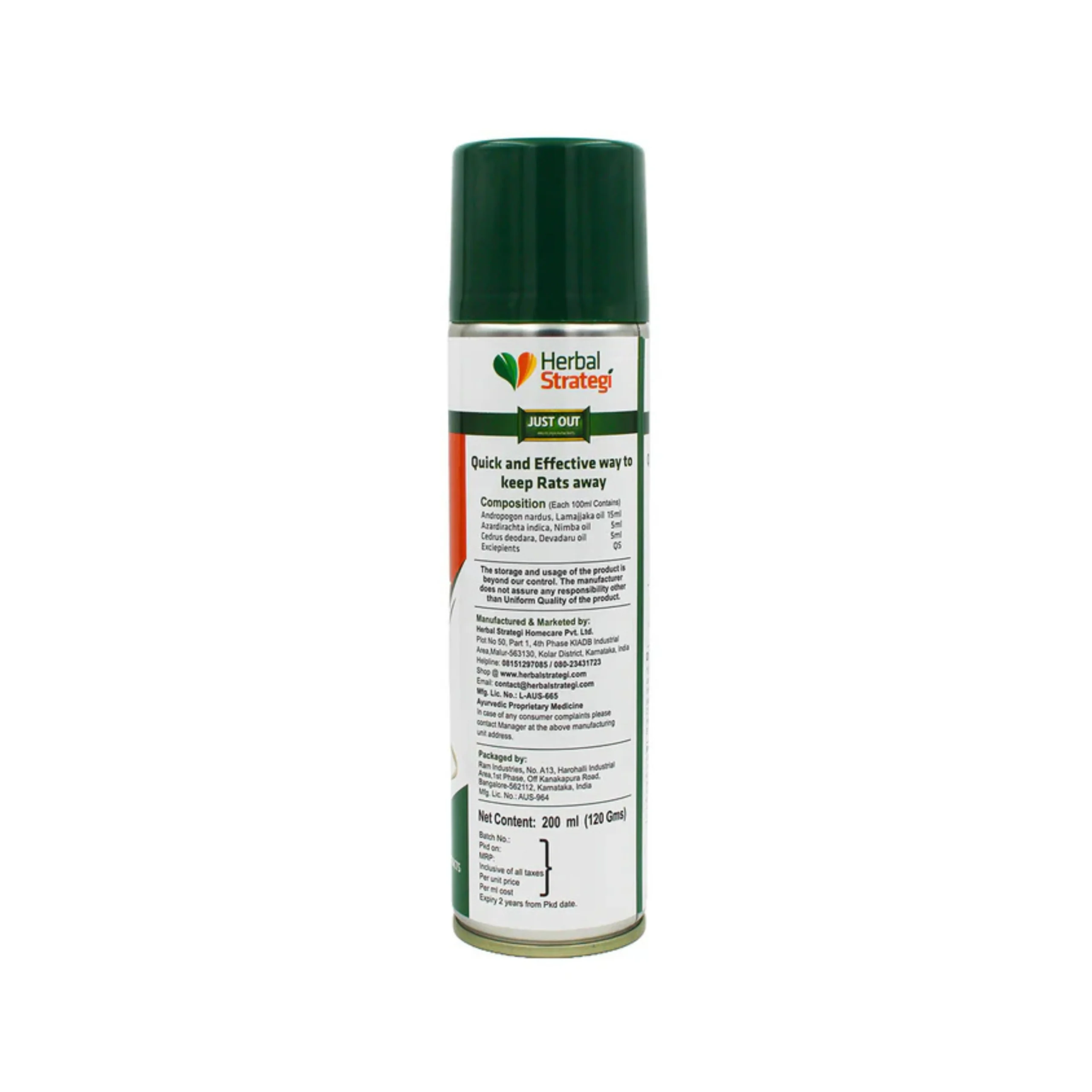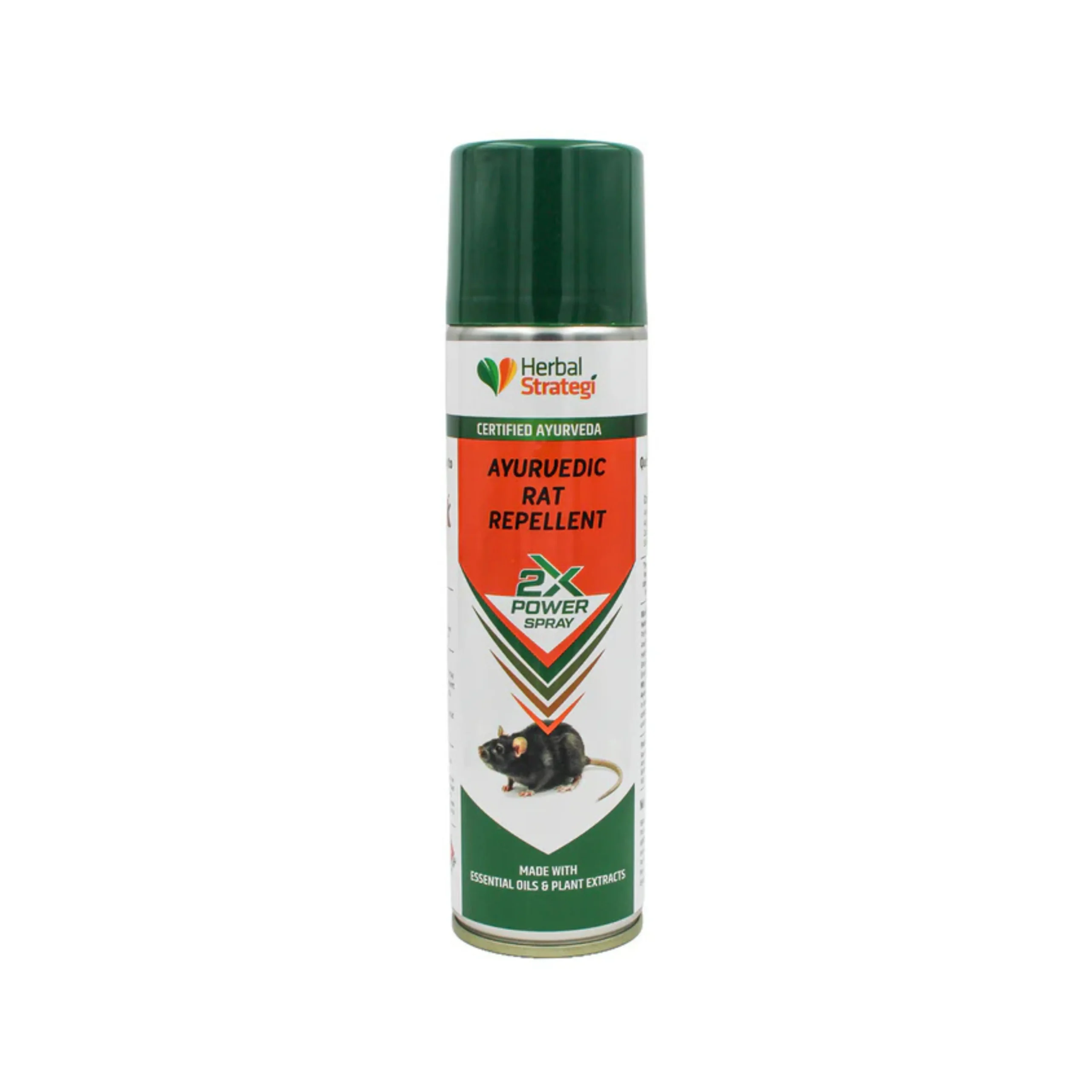 Certified Ayurveda, 100% plant-based aerosol spray formulated with lemongrass (Andropogon nardus), neem (Azadirachta indica), and cedarwood (Cedrus deodara) oils. Creates a strong herbal barrier to deter rats naturally without harmful chemicals or CFCs. Safe for use in homes, offices, and vehicles hypoallergenic and pet- and child-safe