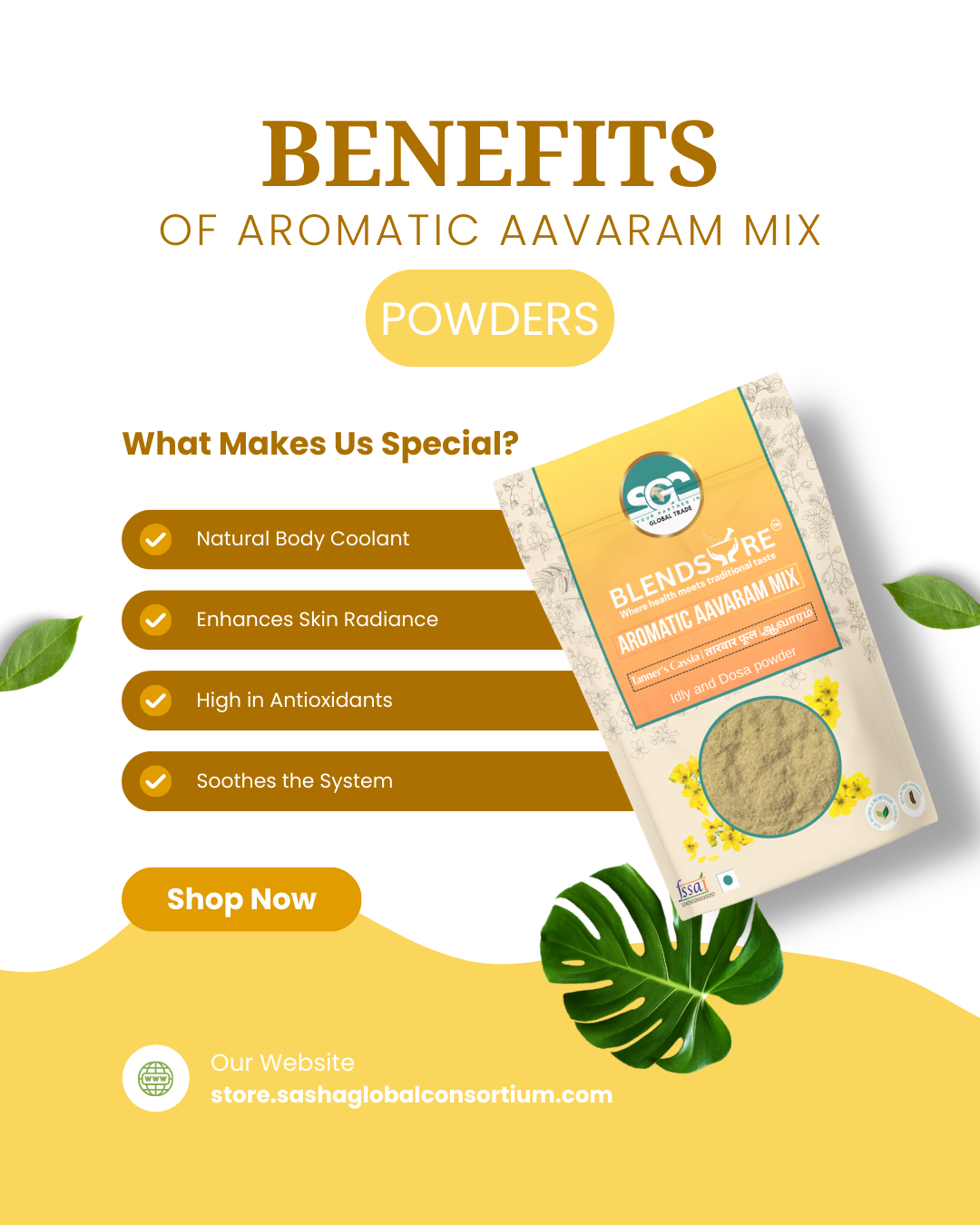 Blendsure Aromatic Aavaram Mix is a uniquely aromatic blend featuring the revered Avarampoo (Tanner’s Cassia) flower. Known as a powerful natural body coolant in traditional Indian wellness, this mix soothes the system and promotes internal balance. Processed to be 100% pure, unprocessed, and sustainably sourced, it helps relieve excessive thirst and enhances comfort.