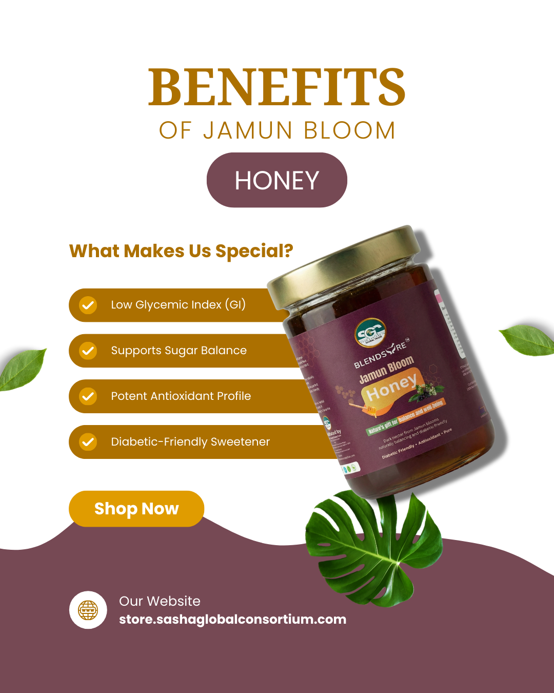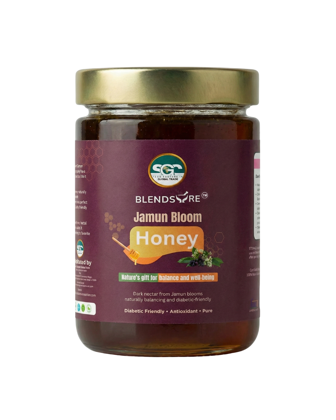 Blendsure Jamun Bloom Honey is harvested from the wild blossoms of Jamun (Indian Blackberry) trees , creating a rare honey with a deep amber hue and a mild tartness. It is naturally low in glycemic index, making it a perfect healthier sugar alternative.