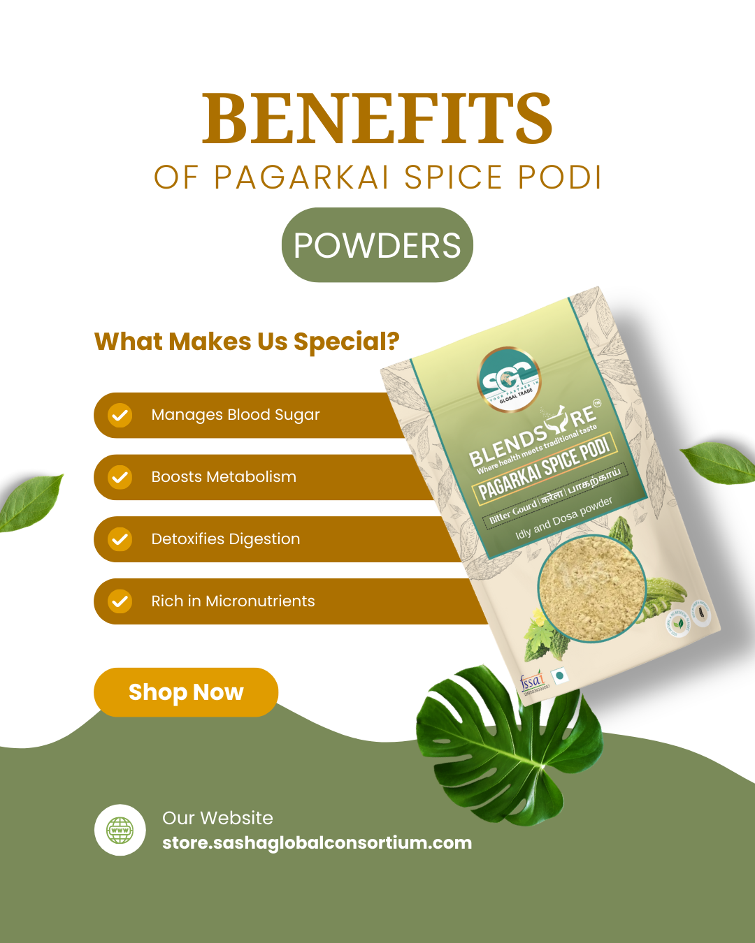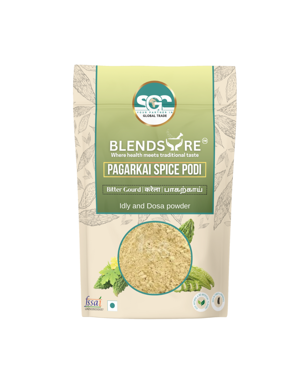 Blendsure Pagarkai Spice Podi is a potent and flavorful blend featuring dried Pagarkai (Bitter Gourd). Expertly roasted with traditional Indian spices, this savory podi transforms the bitter notes into a delicious seasoning. Processed to be 100% pure, unprocessed, and sustainably sourced, it supports healthy blood sugar levels and digestive wellness.
