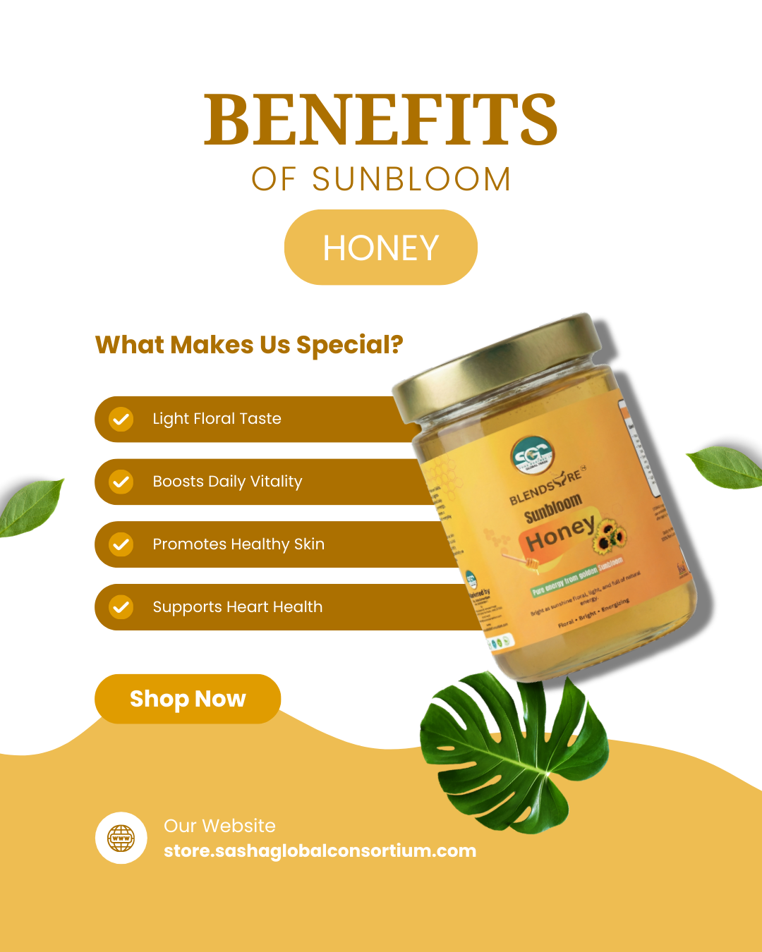 A Boon From Nature’s Treasure Pure energy from golden Sunbloom. Its light floral flavor makes it an accessible choice for the whole family. Positioned as a “jar of sunshine,” it brings brightness and natural sweetness to your table.